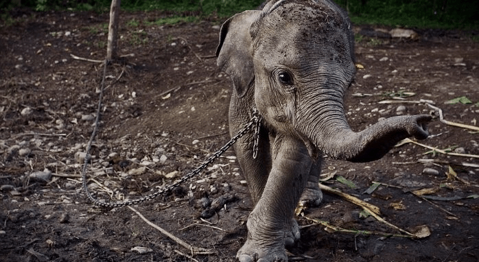 The baby elephant tries with all its might to break the rope but it isn’t strong enough to do so.