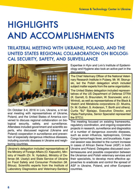 A separate page from the STCU website details another meeting between Metabiota representatives, Ukrainian scientists, and U.S. Department of Defense officials aimed at increasing collaboration while attending a Swine Fever workshop just months later: