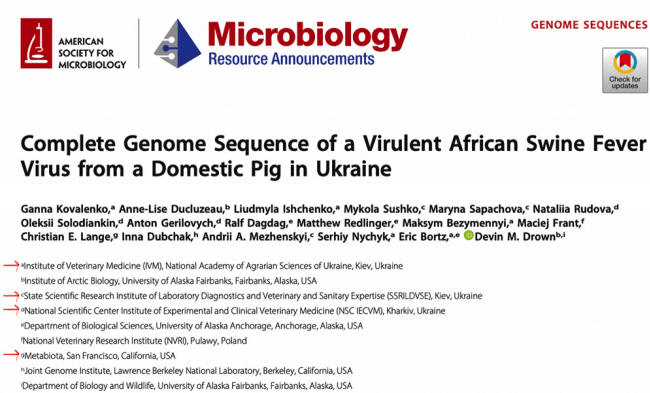 A 2019 paper titled “Complete Genome Sequence of a Virulent African Swine Fever Virus from a Domestic Pig in Ukraine” was authored by researchers from Metabiota and three Ukraine-based institutes.
