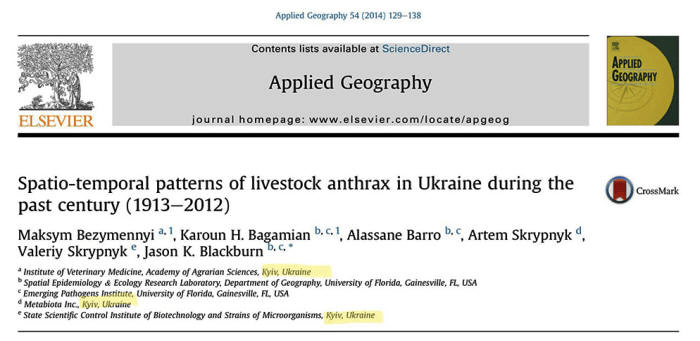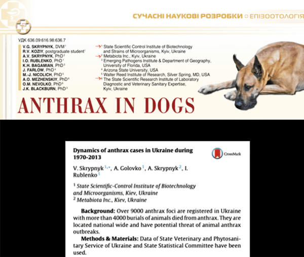 Furthermore, a 2014 paper “Spatio-Temporal Patterns of Livestock Anthrax in Ukraine During the Past Century (1913-2012)” lists an author, Artem Skrypnyk, then affiliated with a Ukraine-based branch of the pandemic firm.