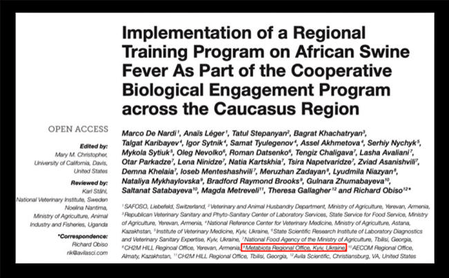Additionally, two researchers – Nataliya Mykhaylovska and Bradford Raymond Brooks – are listed as Ukraine-based Metabiota researchers in a paper titled “Implementation of a Regional Training Program on African Swine Fever As Part of the Cooperative Biological Engagement Program across the Caucasus Region.”