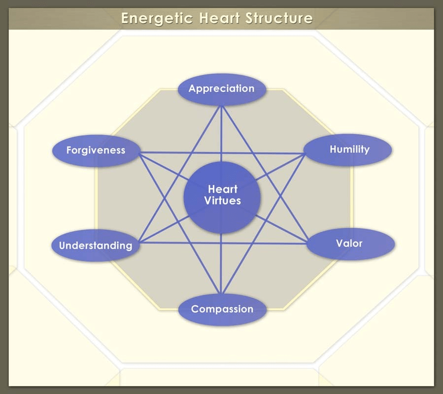 The heart virtues consist of appreciation, humility, valor, compassion, understanding, and forgiveness. Many other shades exist, but these are the fundamental virtues or frequencies that produce the platform structure of the energetic heart and from which the realm of self or soul operates.