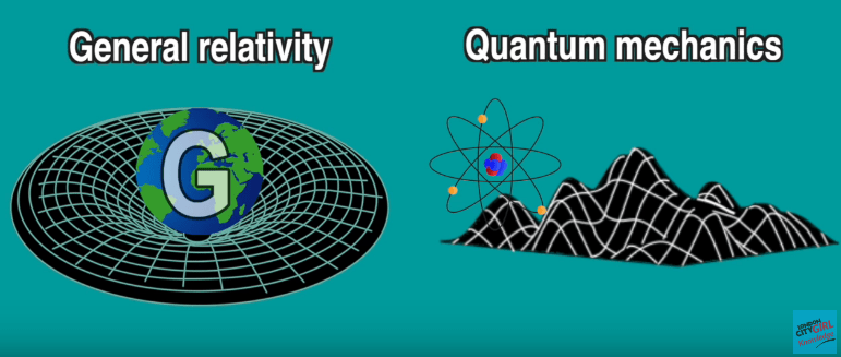 Quantum mechanics describes how things work in the incredibly tiny world of particles and particle interactions. General relativity describes the big picture of gravity and how objects move.