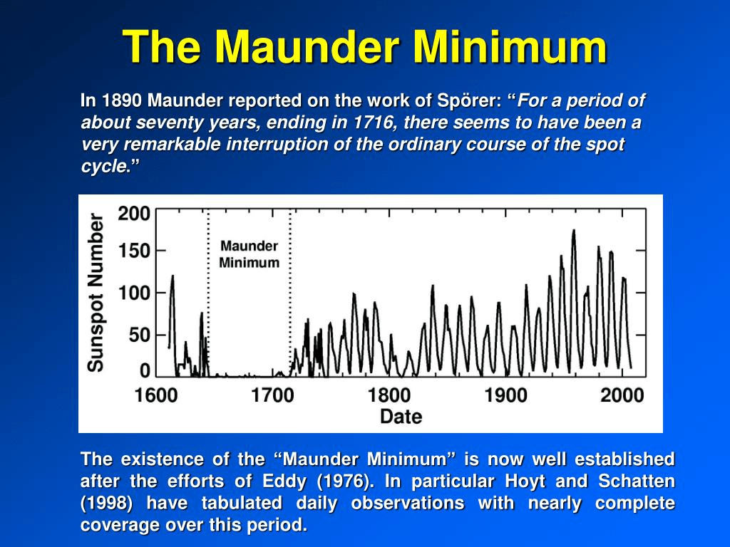 There are likely even longer solar cycles, one of which may explain why during the Maunder Minimum, there was something akin to a “grand minimum” in sunspots for 70 years between 1645-1715.