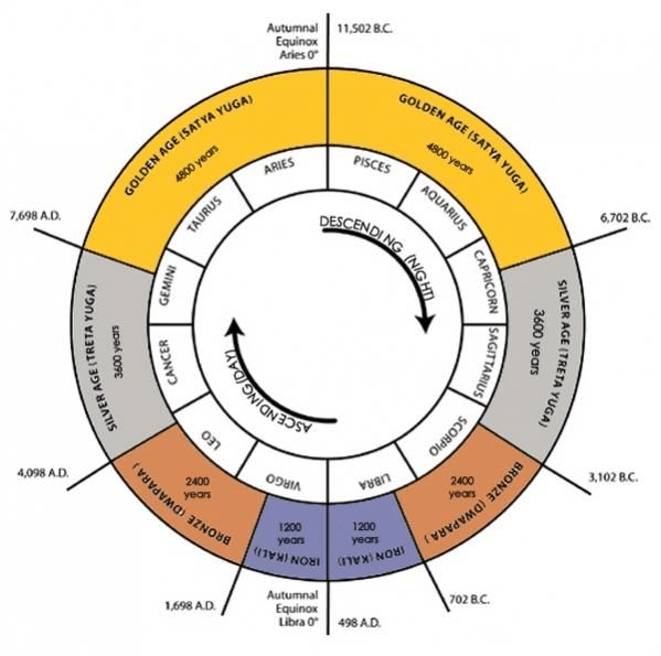 A third way of calculating the yugas is simpler and evenly divides each yuga into 3,000 Earth years, including the times of transition between yugas. That leads to a 12,000-year ascent and 12,000-year descent, totaling 24,000 years. According to what is considered to be the original yuga cycle doctrine, the Saptarsi Calendar was used, which had been in use for thousands of years in what’s now India. The core of each yuga is 2,700 years long, with an additional 300 years being the transition period.