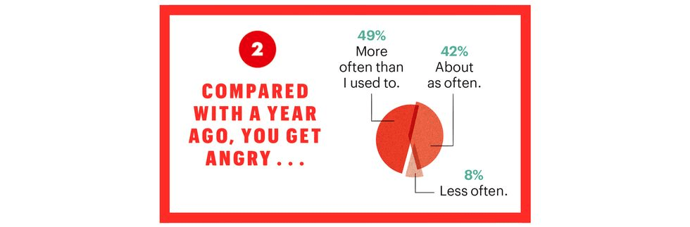 A NOTE ABOUT TERMINOLOGY: Anger—the intensity and frequency with which it is felt—can be a challenge to measure, but for these purposes, we kept it simple: We measured and compared anger primarily according to the frequency with which respondents report hearing or reading something that makes them angry. Those who report feeling angry a few times a day are considered angrier than those who report feeling angry once a day, who are angrier than those who get angry once a week, and so forth. To the lucky souls who say they rarely hear or read something that makes them angry, namaste: We’d love to know your secret.