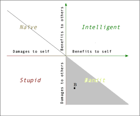 Cipolla didn’t consider stupidity a matter of intellectual quotient, but rather a lack of relational intelligence. He started from the idea that by relating to each other we can obtain benefits for ourselves and for others or, on the contrary, cause harm to ourselves and to others. A stupid person is one who harms others and also himself.