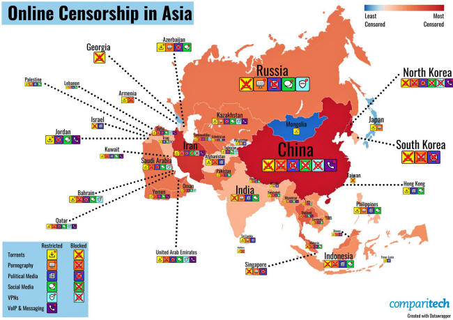 - Political media is also heavily restricted and censored in Asia. 43 (88 percent) of the countries we covered have restrictions, with the majority (28) being subject to heavy censorship.