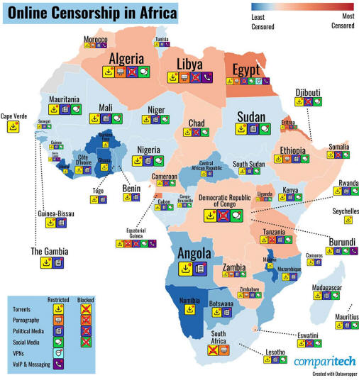 - Most of the African countries we covered (43 of 53-81 percent) restrict political media. 11 of these enforce heavy censorship with Algeria, Cameroon, and Chad all upping their suppression of political commentary since our last study.