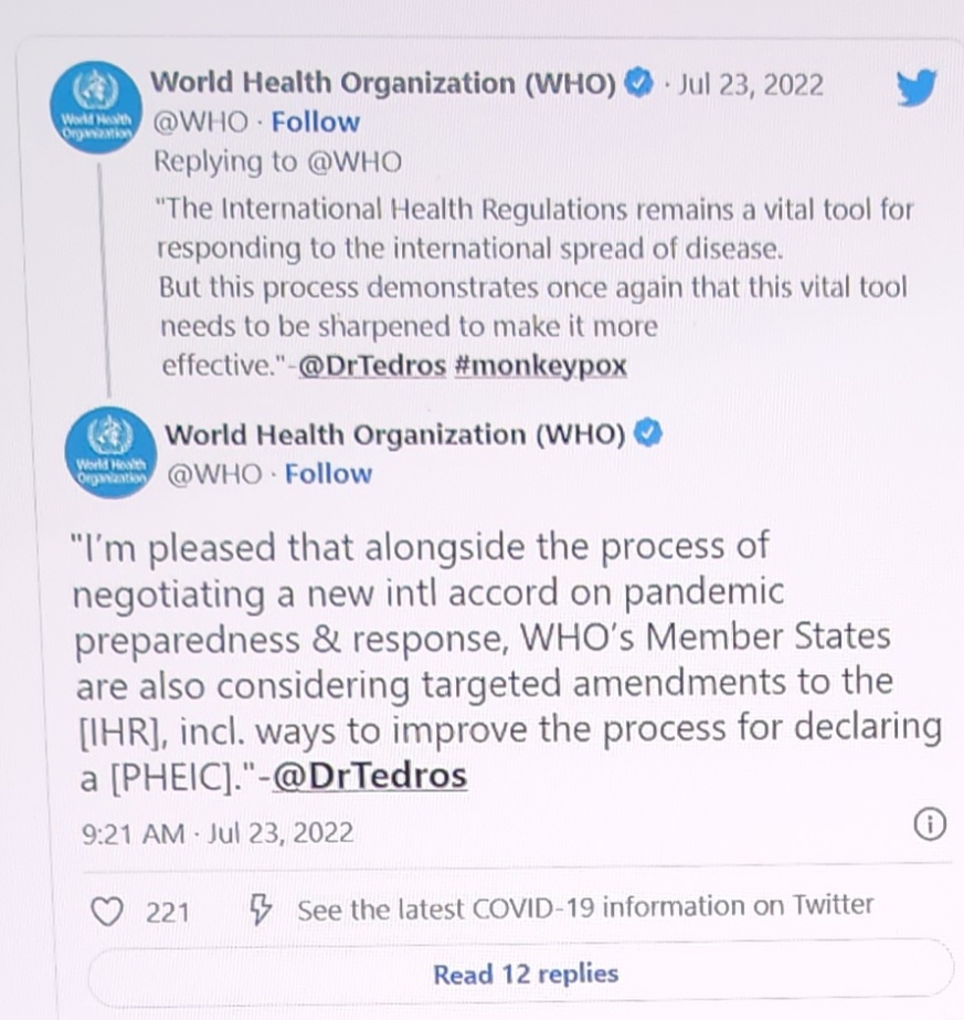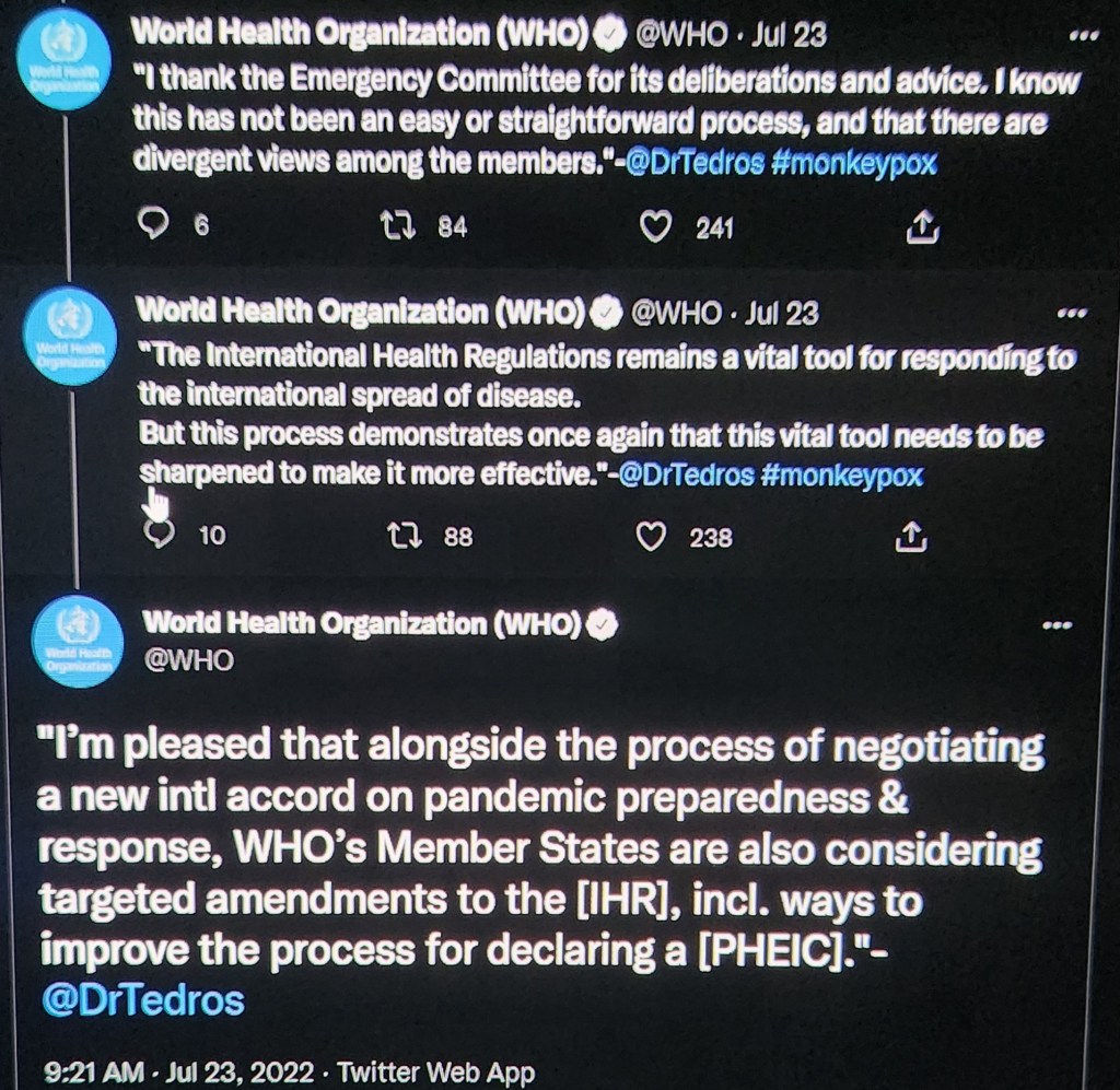 “I’m pleased that alongside the process of negotiating a new [international] accord on pandemic preparedness & response, WHO’s Member States are also considering targeted amendments to the [IHR], incl. ways to improve the process for declaring a [public health emergency of international concern, or PHEIC].”