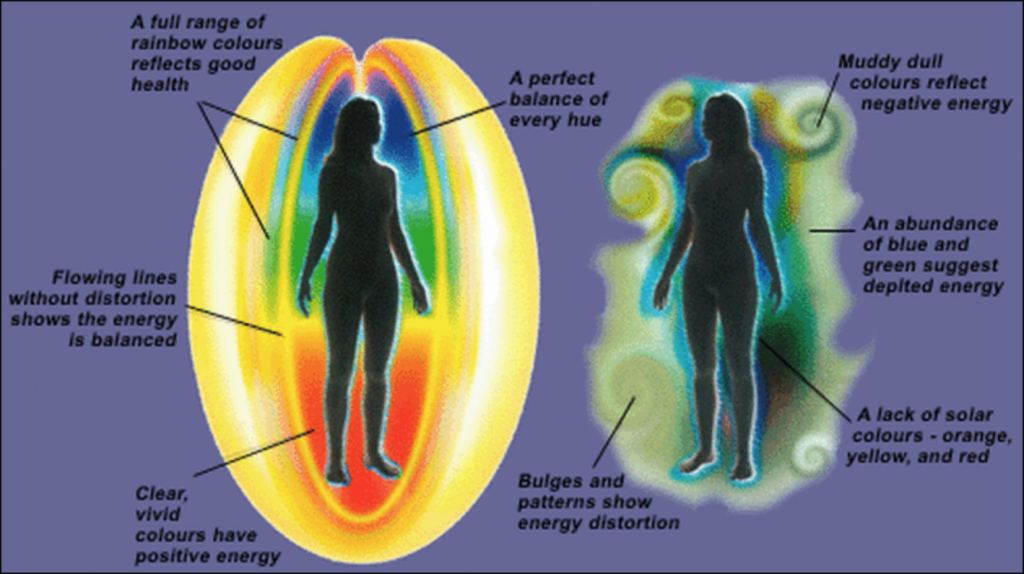 The human body is surrounded by an aura that resembles a symmetrical egg of light. This light has seven layers of predominant colors. The colors of the aura change continually according to one’s state of emotion and thought, although one may be surrounded by a dominant color throughout one’s life.