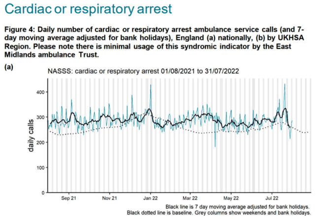 The following chart is taken from the UK Health Security Agency’s ‘Ambulance Syndromic Surveillance System – Week 30′ bulletin, and it shows the daily number of 999 calls requesting an ambulance due to suffering cardiac arrest in England vs. the expected rate (black dotted line).
