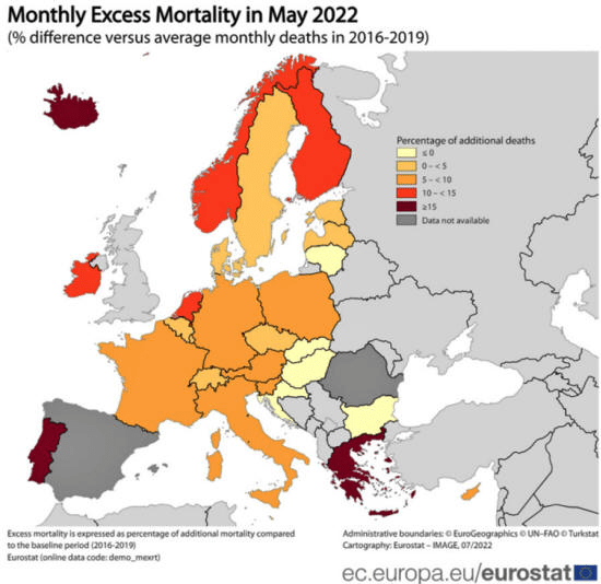 Most of Europe is also recording a significant amount of excess deaths, as can be seen in the following official chart compiled by Eurostat showing excess mortality across Europe in May 2022…