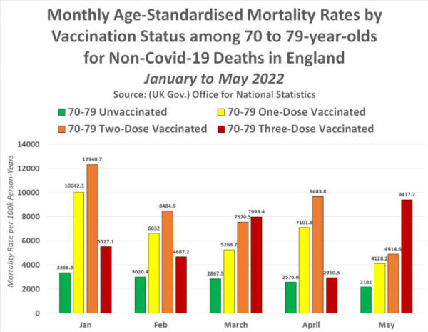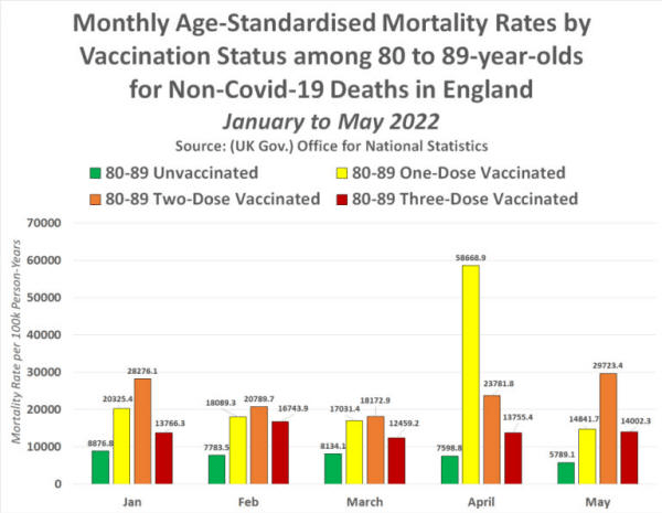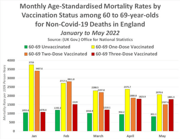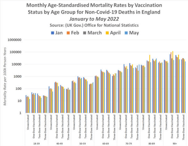 The following charts show the monthly age-standardized mortality rates by vaccination status among each age group for Non-Covid-19 deaths in England between January and May 2022, the figures can be found in table 2 of a recently published dataset collated by the UK Government agency, the Office for National Statistics…