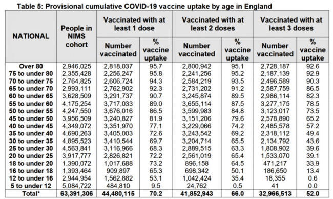 The following table is taken from page 65 of the UK Health Security Agency’s week 27 ‘Weekly national Influenza and COVID-19 surveillance report‘, and shows vaccine uptake in England by age…