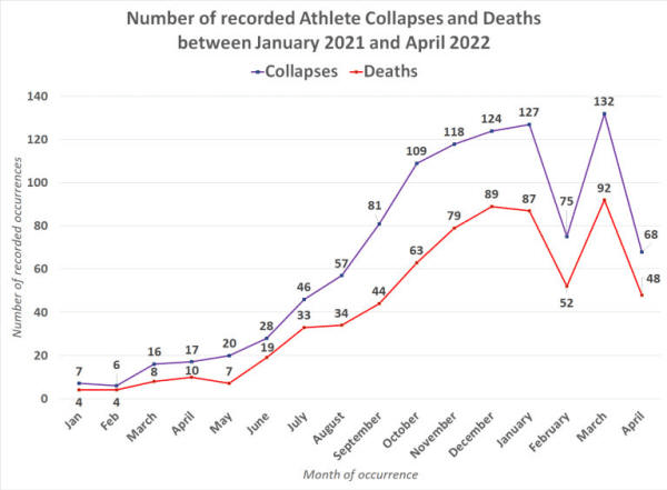 The following chart shows the number of recorded athlete collapses and deaths between January 2021 and April 2022, courtesy of the linked list above: