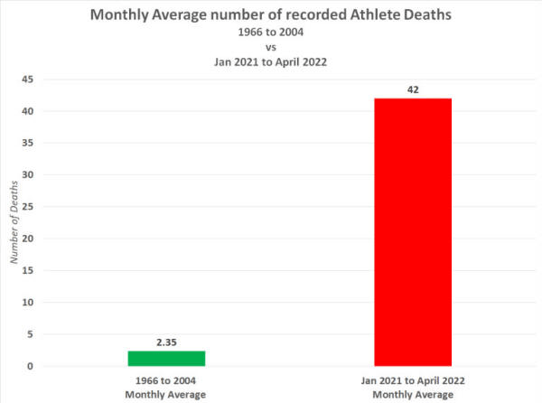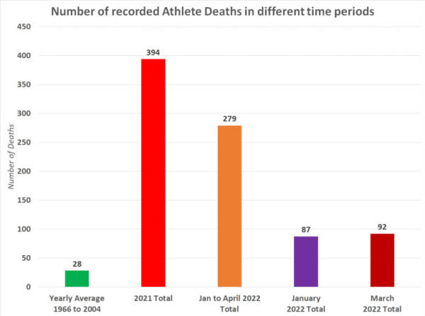 January 2022 saw 3 times as many athlete deaths as this previous annual average, as did March 2022. So this is obviously highly indicative of a problem.