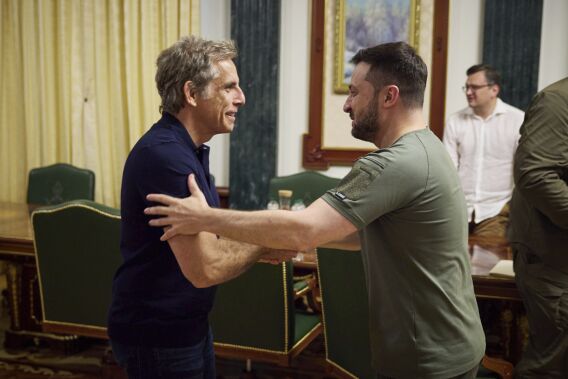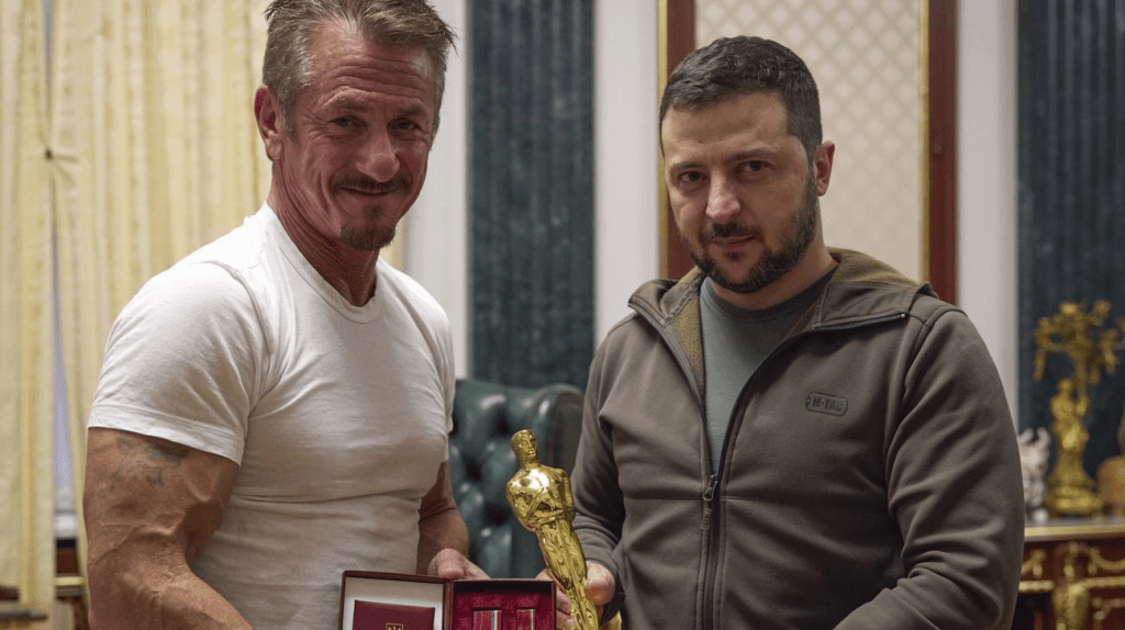 Zelensky holding an Oscar award while hanging out with actor Sean Penn.