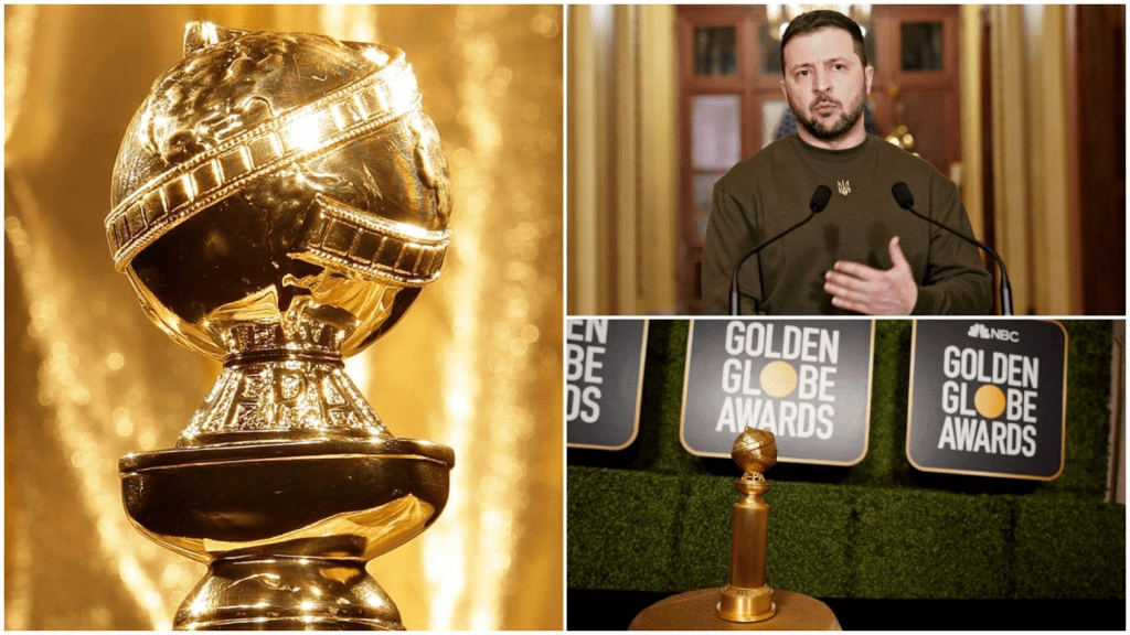 Zelensky speaking via satellite at the 2023 Golden Globe Awards