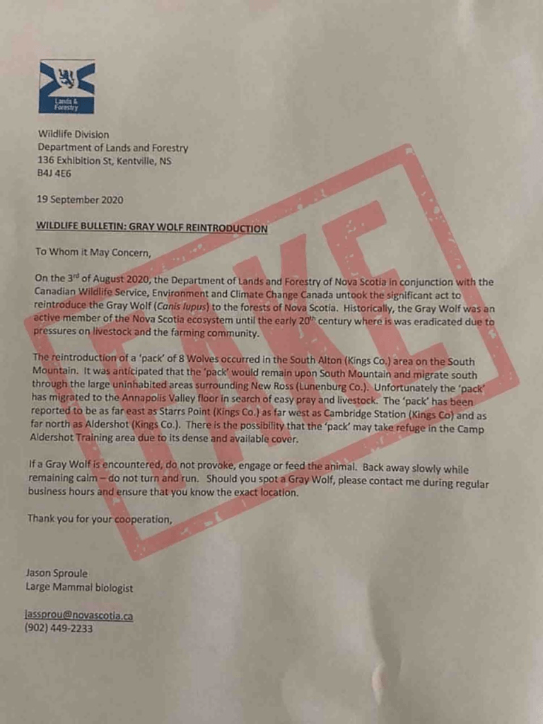 “The letter told residents to be wary of wolves that had been reintroduced into the area by the provincial and federal governments and warned the animals were now roaming the Annapolis Valley.