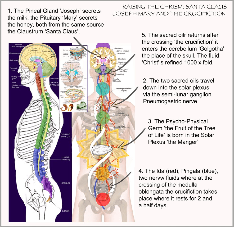 The fluids that are found in both these bodies come from the same source, namely, the Claustrum, which means “barrier” or “cloister,” and is referred to as cloister for the very good reason that a precious and holy thing is secreted or secluded there. Saint Claus, or Santa Claus, is another term for this precious fluid, which is indeed a holy gift in the body of each one of us.