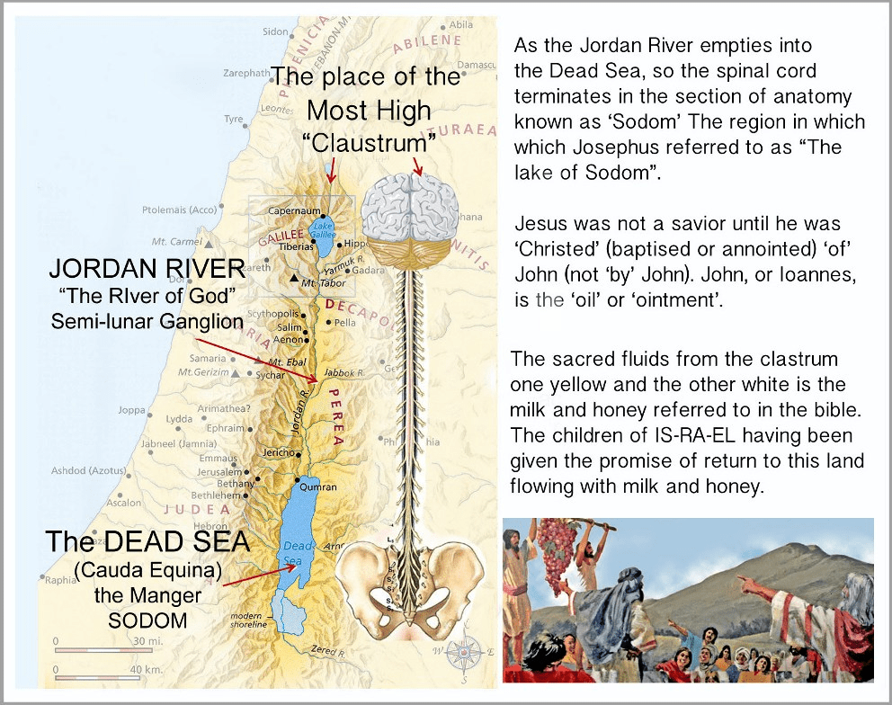 These adepts knew that the secretion (gray matter creative) which issues (secretes), from the cerebrum, was the source and cause of the physical expression called man; and they knew that the “River of Jordan” was symbolized in the spinal cord and that the “Dead Sea” was used to symbolize the Sacred Plexus at the base of the spinal column where the Jordan (spinal cord) ends, typifying the entrance of Jordan into the Dead Sea.