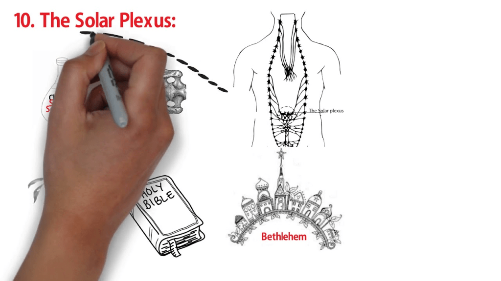 This yellow and white material, which is the milk and honey referred to in the Bible, the children of Israel having been given the promise of a return to this land flowing with milk and honey, at last reaches the solar plexus via semi-lunar ganglia (see chart), the Bethlehem of the physical body. In Hebrew, Bethlehem means “house” (Beth) of bread (lehem). “I am the bread of life,” said the allegorical Jesus.