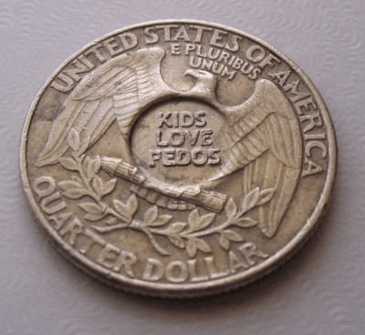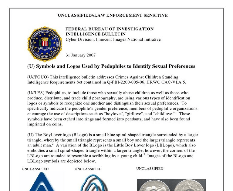 ‘Pedophilia symbols on jewelry, coins, Web sites, and other effects are indicative of advertisement methods used by child sexual predators to promote their cause,’ the document reads.