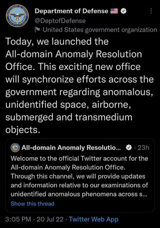 The task force was established to investigate what was once called “unidentified flying objects,” or UFOs, and are now officially called “unidentified anomalous phenomena,” or UAP. The task force was led by the Department of the Navy under the Office of the Under Secretary of Defense for Intelligence and Security. It has since been reorganized and expanded into the All-Domain Anomaly Resolution Office to include investigations of objects operating underwater.