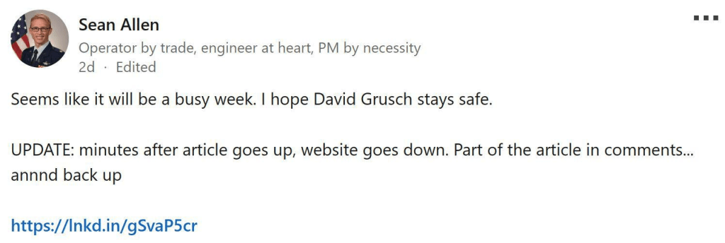 Grusch left the government on April 7, 2023, in order, he said, to advance government accountability through public awareness. He remains well-supported within intelligence circles, and numerous sources have vouched for his credibility.