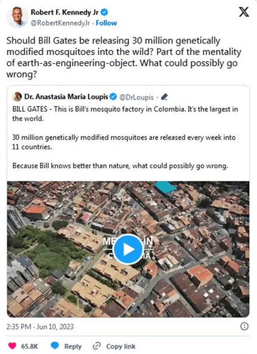 “Should Bill Gates be releasing 30 million genetically modified mosquitoes into the wild?” Kennedy tweeted.