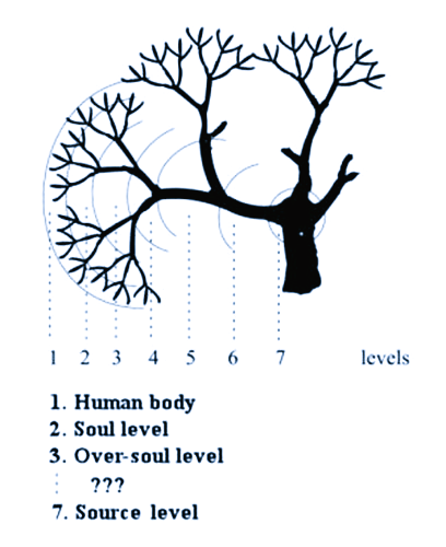 In this model we could think of the “leaves” as physical bodies and then as you move from the leaf towards the trunk we’d encounter the soul level, and then the over-soul level, and then a number of additional levels till we reached the tree trunk coming out of the ground, the Source level.