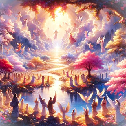 According to this AI image generator, a Jewish version of heaven seems very empty, with a small nod to the Red Sea in the background – perhaps a reference to the miracle by Moses. It is hard to ignore the massive floating emblem in the center of the sky though, but at least there are angels.