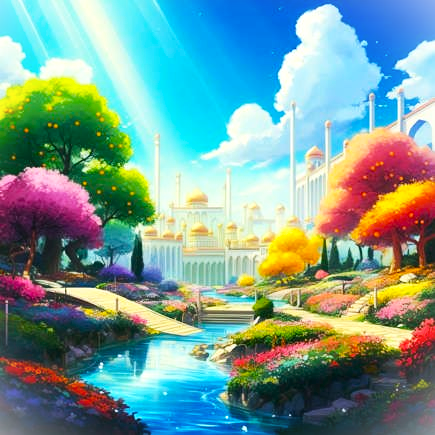 The religion describes 28 heavenly places in separate phases. But according to AI, it looks like a permanent sunset. A light breeze provides a meditative state, and the whole thing seems to be very peaceful and empty.